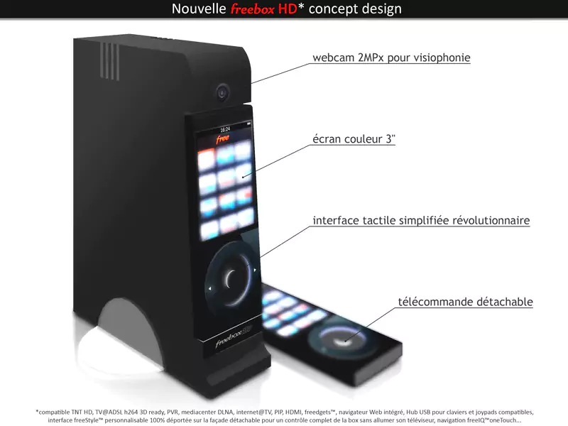 En attendant la sortie de la future box de Free qui devait arriver quelques mois plus tard un freenaute passionné et très créatif, Spamnco, avait imaginé le design de la box de ses rêves et avait fait parvenir à Univers Freebox un concept de design assez abouti. A l’époque le seul élément sur lequel avait communiqué Free était que la Freebox v6 intégrerait une Femtocell. Suite à la publication de la création de Spamnco, d’autres freenautes lui avaient emboîté le pas. Des idées de design pour la Freebox V7 et sa petite soeur d’entrée de gamme attendues d’ici la fin de l’année ?
