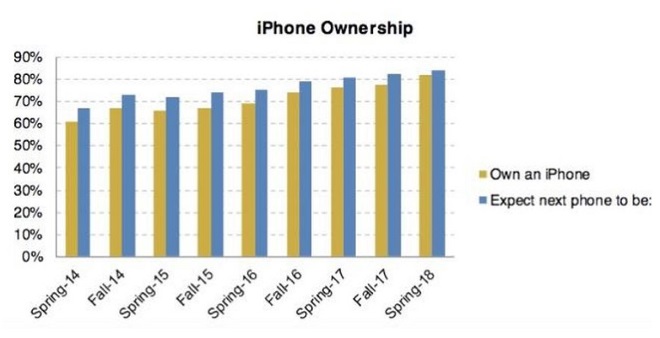 Il résulte de ce sondage que sur 6000 jeunes américains âgés de 16 ans et demi en moyenne, pas moins de 82% d’entre eux possèdent un iPhone. A titre de comparaison, en avril 2016, ils n’étaient que 69% à détenir un iPhone, le chiffre a donc augmenté de 13% en deux ans. De plus, 84% d’entre eux comptent également faire l’acquisition d’un iPhone comme prochain mobile. Là aussi, le pourcentage a augmenté de 9% par rapport à 2016.