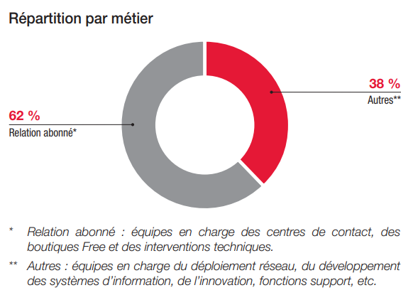 Free a choisi de développer en interne ses centres de contact, ce qui, selon lui, contribue à la qualité du service rendu. Le service Relation abonné comprend les salariés des sept centres de contact du Groupe, situés majoritairement en France, les équipes de techniciens itinérants dédiés au service « assistance à domicile » ainsi que les salariés des différents 57 Free Centers (boutiques).
