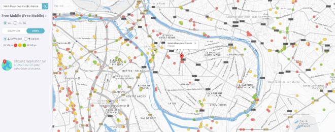 Selon les résultats des tests effectués par les abonnés Free Mobile, les zones rouges ont un débit inférieur à 20Mb/s, pour les zones jaunes le débit est compris entre 20 et 60Mb/s et pour les zones vertes le débit est au dessus de 60Mb/s.
