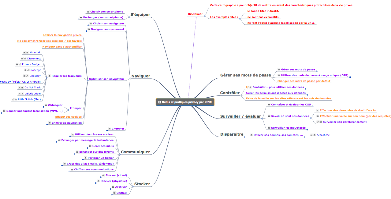 Grâce à cette carte produite par le truchement de Framindmap, un outil libre de création et partage de cartes mentales, la CNIL veut donner à voir les différentes possibilités offertes pour que chaque individu soit en mesure d’adopter des outils "privacy friendly". A ces outils s’ajoute des pratiques de protection qui ne nécessitent pas l’utilisation de logiciel.
