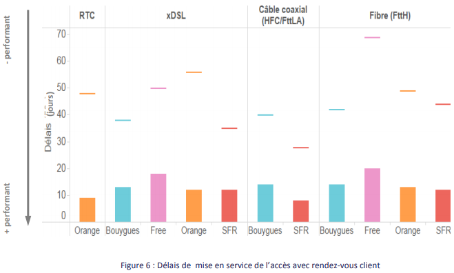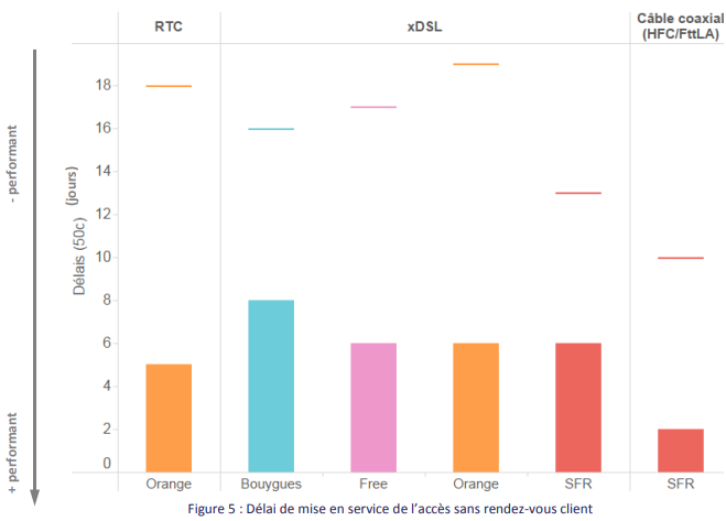 En termes de délai de raccordement sans intervention de technicien, Free annonce 50% des raccordements en 6 jours, 95% en 17 jours. L’opérateur historique, Orange, affiche le même nombre de jours pour 50% des raccordement, mais met 2 jours de moins à raccorder 95% de ses lignes. Free est, en revanche, moins long que Bouygues Télécom, avec des délais de 8 jours pour 50% des raccordements.