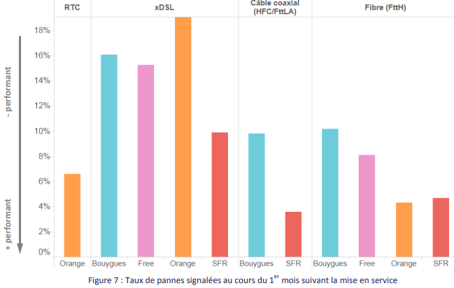 L’ARCEP a également relevé le taux de pannes au cours du 1er mois suivant la mise en service. A ce jeu là, Free affiche un taux de 15% d’incidents pour l’ADSL. Ce résultat est meilleur qu’Orange (19%) et Bouygues Télécom (16%), mais c’est SFR qui arrive en tête avec 10%.