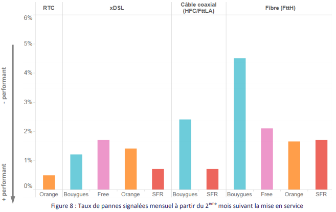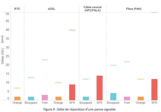 Lorsqu’une panne survient, SFR est très nettement le plus mauvais élève avec plus de 10 jours pour résoudre 50% des problèmes, en ADSL, et jusqu’à plus de 40 jours pour résoudre 95% des problèmes. SFR affiche des résultats encore plus médiocres sur la fibre et le câble. Cela explique pourquoi il y a tant d’insatisfaction chez les clients SFR, comme l’ont montré les différentes études à ce sujet, comme celles de l’UFC Que Choisir ou 60 millions de consommateurs. Orange affiche à l’inverse les meilleurs chiffres, avec un délai de 2 jours pour réparer une panne, que ce soit en ADSL ou fibre. Sur cette technologie Free se retrouve à égalité, avec également 2 jours, un chiffre qui monte à 3 jours pour l’ADSL.