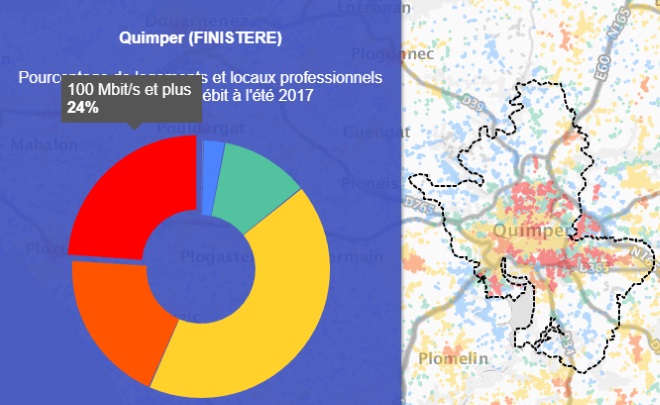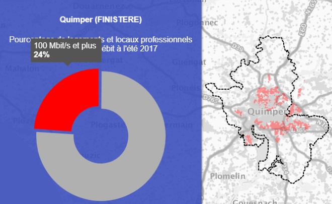 Grâce à la première carte on peut voir que la ville de Quimper est couverte à 43.5% par le très haut débit.