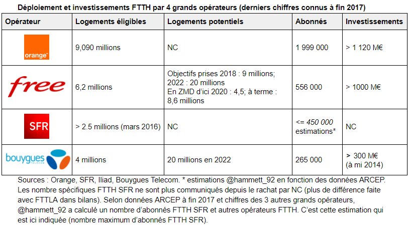 A noter que tous les opérateurs ont publié le nombre de leurs abonnés FTTH pour le 4ème trimestre 2017, sauf SFR, qui mélange ses abonnés Câble et abonnés FTTH. Pour connaitre le chiffre de l’opérateur il faut donc prendre le chiffre total publié par l’ARCEP et soustraire les autres opérateurs. La ligne "SFR" intègre donc les abonnés SFR, mais également les abonnés aux opérateurs alternatifs sur les RIP.