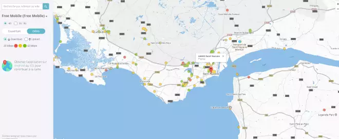 Selon les résultats des tests effectués par les abonnés Free Mobile, les zones rouges ont un débit inférieur à 20Mb/s, pour les zones jaunes le débit est compris entre 20 et 60Mb/s et pour les zones vertes le débit est au dessus de 60Mb/s.