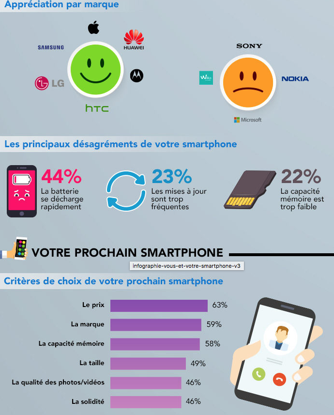 Premier enseignement, le prix d’achat d’un smartphone en 2017 est de 326 euros. Apple reste en tête (529€), devant Samsung (344€) et Sony (286€). Mais le sud-coréen reste la marque la plus répandue et creuse l’écart sur la concurrence. En effet, d’après l’association, « 46 % d’entre vous possèdent un smartphone Samsung, contre 45 % auparavant. Apple est toujours bon deuxième (22 %), mais comme tous les autres fabricants, le californien a été délaissé (1 à 2 points perdus depuis notre dernier sondage) au profit, principalement, de Huawei. Grâce à ses nombreux modèles de bonne qualité, le chinois s’offre, sans rougir, la troisième place ». La présence des smartphones du fabricant sur le marché français est d’ailleurs en forte progression puisqu’elle a plus que triplé passant de 2% en 2016 à 7% en 2018. En moyenne, les consommateurs français changent de smartphone tous les 3 ans. 20 % d’entre-eux pensent même changer dans les 12 mois, avec un budget qui ne devra pas dépasser 323 €. Le prix est davantage important pour faire son choix, la marque aussi ainsi que la capacité de stockage.