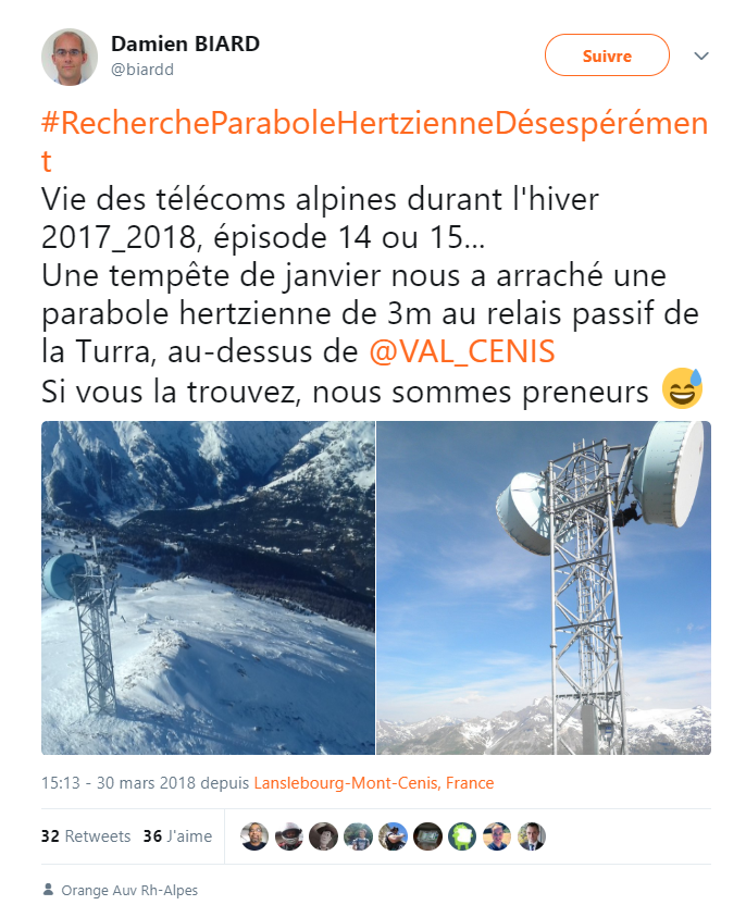 Seulement voilà, le matériel qui mesure tout de même 3 mètres, reste introuvable depuis janvier au point qu’Orange lance une alerte enlèvement avec le hastag #RechercheParaboleHertzienneDésespérément.