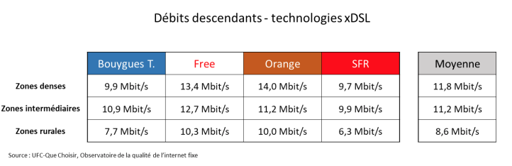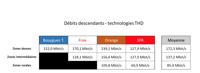 Sur les débits descendants concernant le THD, fibre et coaxial, il convient de relever que « quelle que soit la zone considérée, les débits offerts par Orange sont supérieurs à ceux relevés via les panélistes abonnés aux autres FAI et dépassent en moyenne systématiquement le seuil de 100 Mbit/s. C’est en zones denses que les débits sont les plus hauts, Orange présentant un débit de 239,1 Mbit/s, devant Free (170,1 Mbit/s) Bouygues Telecom (152,0 Mbit/s) et SFR (127,9 Mbit/s). SFR qui est, en l’état de notre Observatoire, le seul FAI à pouvoir être comparé à Orange en zones rurales, y présente le débit le plus faible de notre tableau (60,9 Mbit/s) », analyse UFC-Que Choisir.