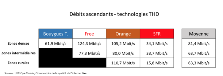 Côté débits montants, l’association de consommateurs note que SFR a dans toutes les zones les débits les plus faibles, « ceci étant cohérent avec l’utilisation du câble par SFR, cette technologie n’offrant pas des débits symétriques, ce que peut permettre le FttH, même si toutes les offres FttH du marché ne présentent pas nécessairement cette caractéristique. »
