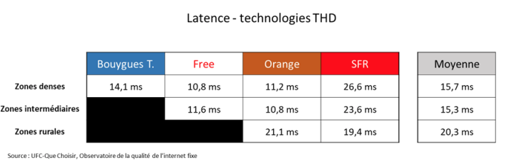 Sur le THD, Free et Orange creusent l’écart sur Bouygues en zones denses, SFR est à la traîne. Les technologies THD permettent en moyenne une réduction importante de la latence supérieure à 50 % dans toutes les zones.