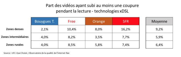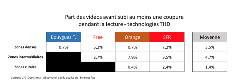 A noter que compte tenu « de la sous-représentativité marquée des panélistes abonnés à une offre Bouygues Telecom très haut débit (THD) ou à une offre Free THD dans les zones rurales, et des abonnés à une offre Bouygues Telecom dans les zones intermédiaires, aucune donnée pour ces profils n’est renseignée dans cette première publication de l’Observatoire de la qualité de l’internet fixe », précise UFC-QUe Choisir.