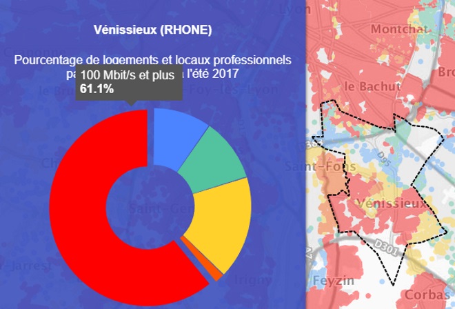 Grâce à la première carte on peut voir que la ville de Vénissieux est couverte à 61.1% par le très haut débit.