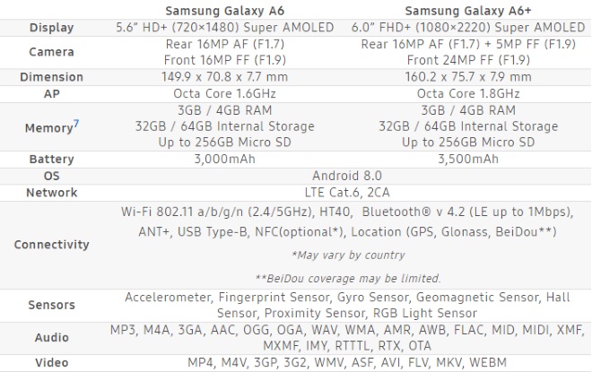 Le Galaxy A6 dispose d’un processeur octo-core cadencé à 1,6 GHz. Bien que le modèle ne soit pas précisé par Samsung, il s’agit probablement du SoC maison Exynos 7870. Il est accompagné par 3 ou 4 Go de mémoire vive ainsi que 32 à 64 Go de stockage interne extensible avec une carte micro-SD. L’appareil bénéficie d’un écran Super AMOLED HD+ de 5,6 pouces, au format 18,5:9 ainsi que d’une batterie d’une capacité de 3000 mAh.