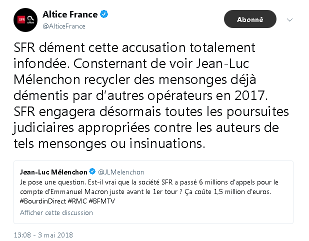 Lors d’une interview accordée hier à Jean-Jacques Bourdin sur BFM TV, Jean Luc Mélenchon a sous entendu que SFR avait passé "6 millions d’appels pour le compte d’Emmanuel Macron". Aujourd’hui, Altice France apporte un démenti ferme en accusant Jean-Luc Mélenchon de "recycler des mensonges". L’opérateur assure par ailleurs qu’il engagera désormais des poursuites judiciaires contre ceux qui propageront "de tels mensonges ou insinuations"