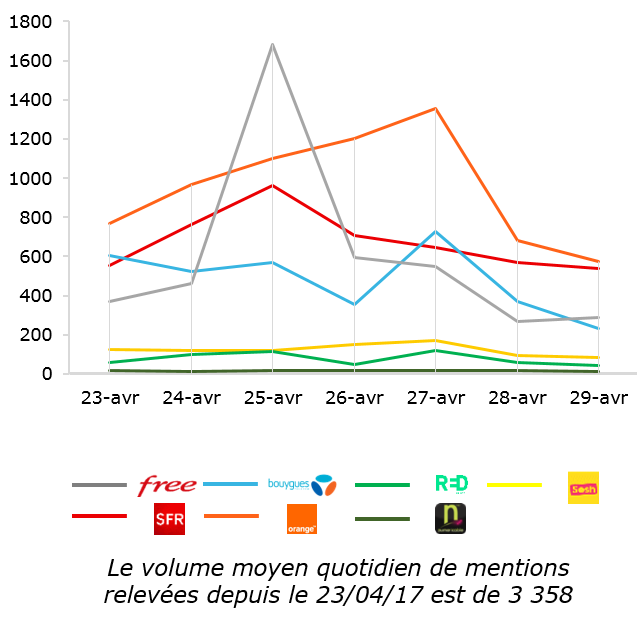 Netino (Webhelp) et Synthesio viennent de publier leur étude hebdomadaire sur la perception sociale des principaux opérateurs télécoms sur le marché français pour la semaine du 23 au 29 avril 2018. Cette étude se base sur la collecte automatique des données sur un corpus de plus de 600 000 000 sites, blogs, forums, profils Facebook et Twitter.