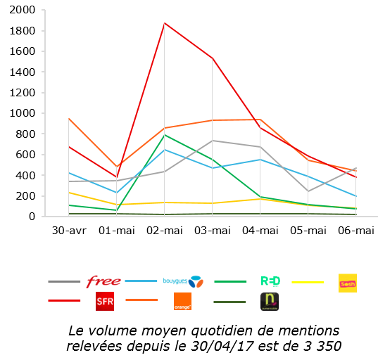 2ème – La polémique autour de l’accusation lancée par Mélenchon concernant les supposés 6 millions d’appels passés par SFR pour la campagne de Macron a beaucoup fait parler. Elle a même généré un pic pour SFR le 2 mai.