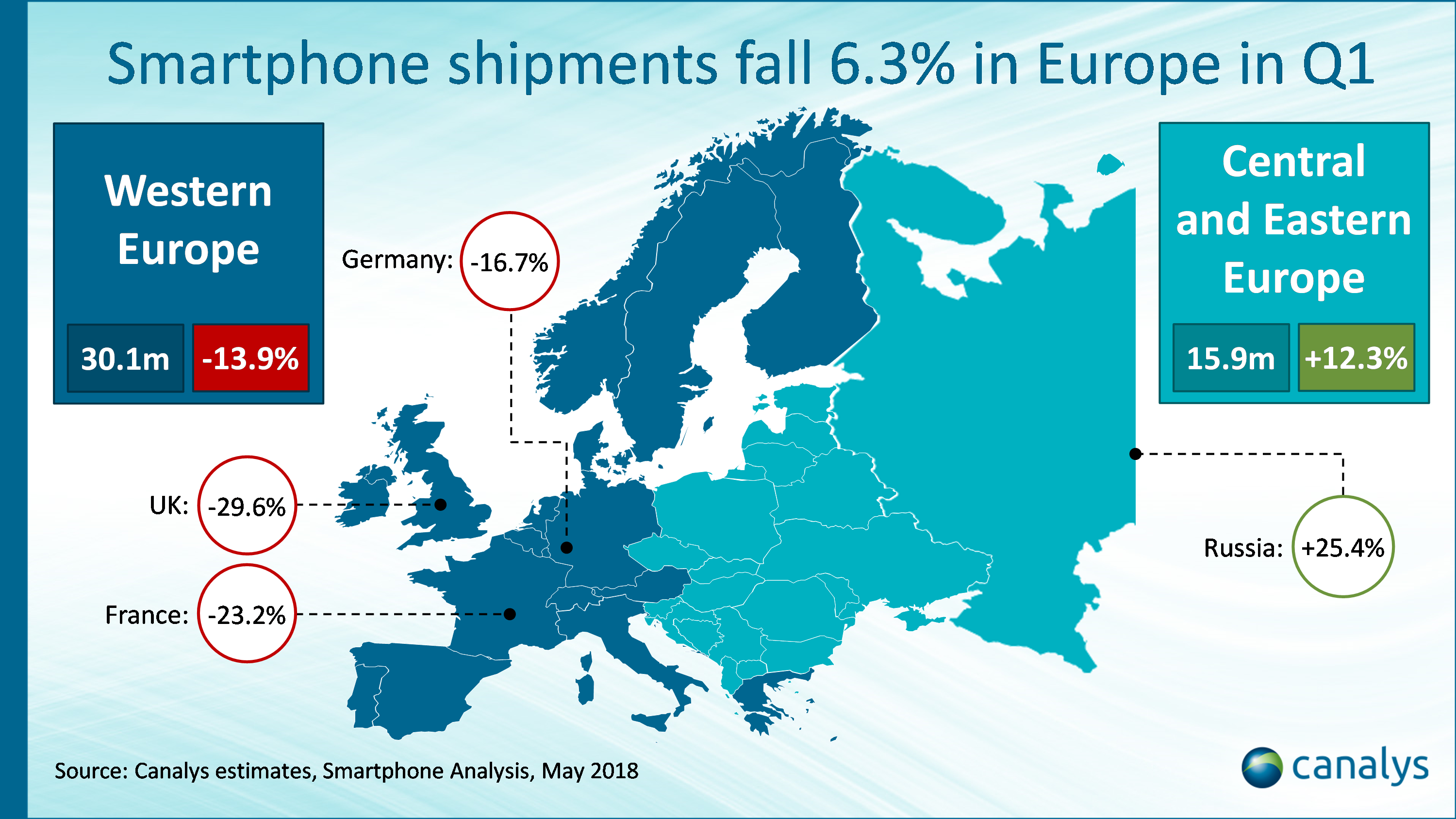 Au premier trimestre de 2018, les livraisons de smartphones ont chuté de 6,3% par rapport à l’année précédente, soit la plus forte baisse jamais enregistrée en un seul trimestre selon Canalys.