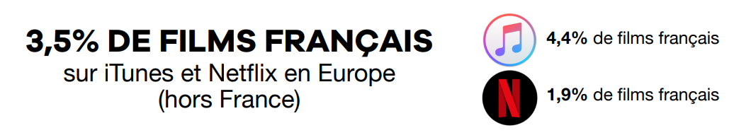 Et le moins que l’on puisse dire est que le cinéma français ne brille pas par sa présence sur ces 2 plateformes de VOD. En moyenne, il y a 3,5% de films français sur iTunes et Netflix dans les pays européens, hors France, et seulement 1,9% sur Netflix.