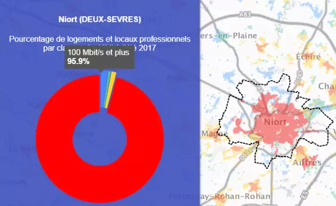 Grâce à la première carte on peut voir que la ville de Niort est couverte à 95.9% par le très haut débit.