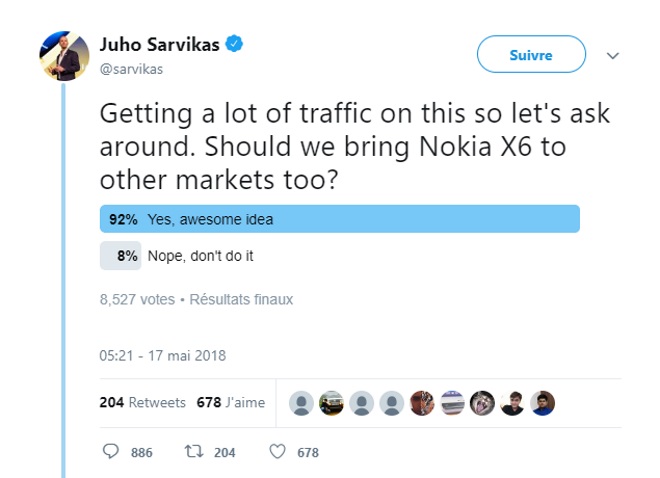 Initialement réservé à la Chine, le Nokia X6 pour sa part, pourrait lui aussi s’étendre à l’international. Le chef de produit chez HMD Global, Juho Sarvikas a lancé un sondage sur Tweeter, afin de savoir si ses abonnés seraient intéressés par une disponibilité étendue à d’autres pays que la Chine. Le résultat parle de lui-même, 92% des 8 527 abonnés ayant voté ont répondu que c’était une bonne idée selon eux.