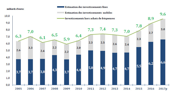 C’est un record historique. Cela représente une augmentation de 37% en trois ans et un quart du chiffres d’affaires des opérateurs. L’appel de l’Arcep à accélérer et casser la tirelire sur l’investissement et le déploiement a donc porté ses fruits, rapporte son président Sébastien Soriano. Autre constat, le trio Orange, Free et SFR « pèsent 80% de ces investissements » a tenu à préciser l’intéressé dans lignes du Monde. Orange pour un peu moins de la moitié. A noter la forte présence de Free qui a largement co-investi avec l’opérateur historique sur la fibre. Dans le détail, les opérateurs ont investi 6,6 milliards d’euros dans les réseaux fixe, en particulier dans le déploiement de la fibre (FttH), et 3 milliards d’euros dans les réseaux mobiles. Autre enseignement, le marché des télécoms est relativement stable en 2017 à 36,16 milliards d’euros (-0,4%) après plusieurs années de recul, porté par une une légère progression du marché mobile (+0,2%) qui compense en partie la baisse du marché fixe.