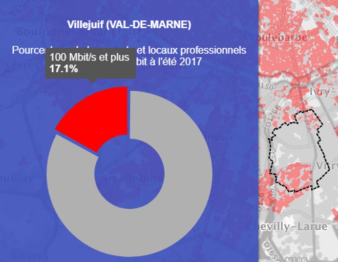 Grâce à la première carte on peut voir que la ville de Villejuif est couverte à 85.3% par le très haut débit.