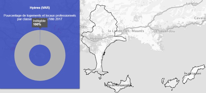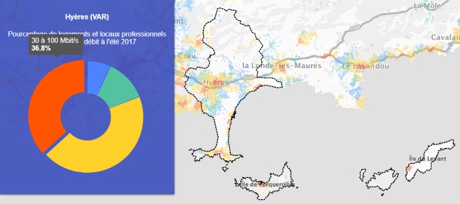 Grâce à la première carte on peut voir que la ville de Hyères est couverte à 36.8% par le très haut débit.