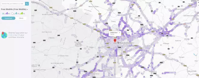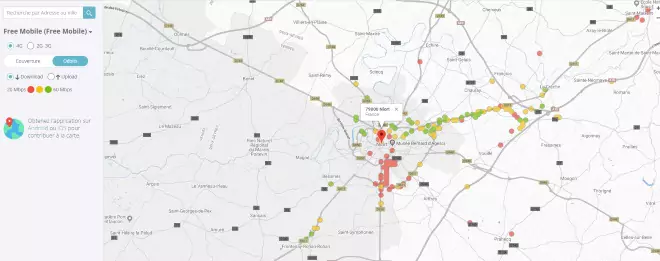Selon les résultats des tests effectués par les abonnés Free Mobile, les zones rouges ont un débit inférieur à 20Mb/s, pour les zones jaunes le débit est compris entre 20 et 60Mb/s et pour les zones vertes le débit est au dessus de 60Mb/s.