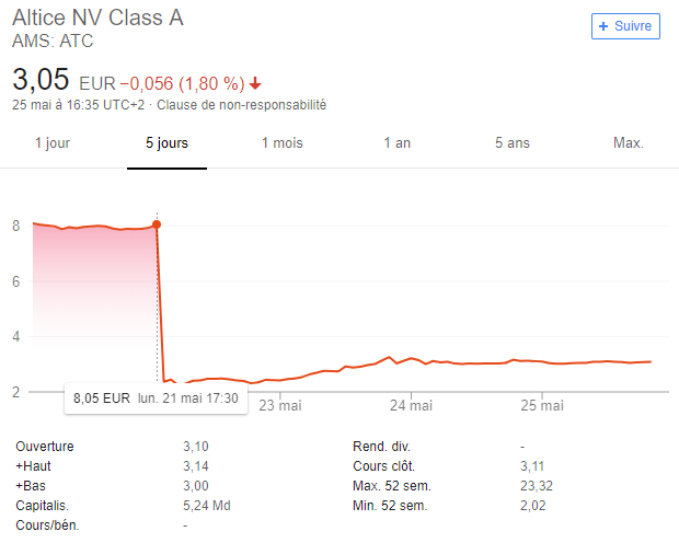 Le groupe de Patrick Drahi annonce dans un communiqué préparer la scission d’Altice USA de la holding Altice NV renommée ensuite Altice Europe ce qui explique la chute de près de 70% du titre d’Altice NV en bourse.