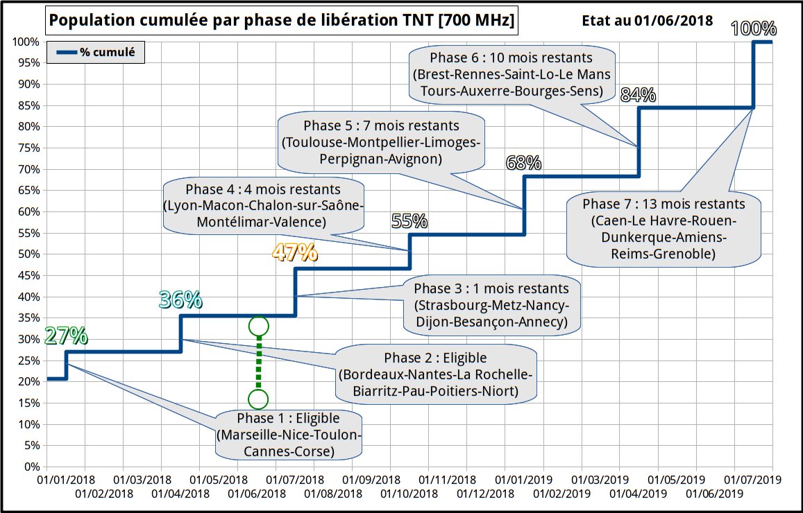Afin de mieux se rendre compte de la population qui sera susceptible de bénéficier des fréquences 700MHz, @fr33 a réalisé un graphique montrant le pourcentage de la population éligible en fonction de l’ouverture de chacune des phases :