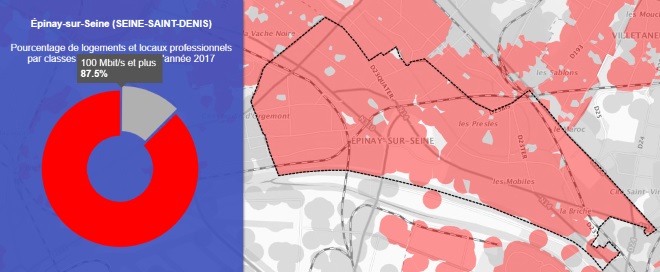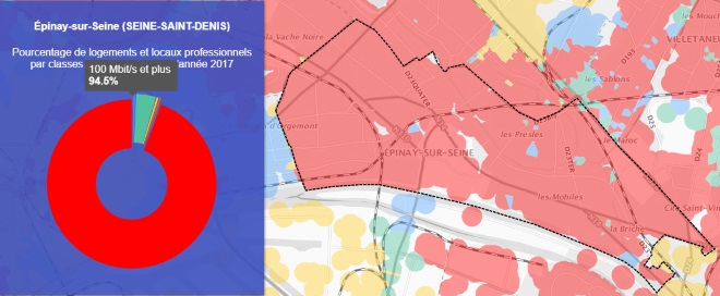 Grâce à la première carte on peut voir que la ville d’Épinay-sur-Seine est couverte à 95% par le très haut débit.