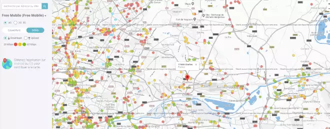 Selon les résultats des tests effectués par les abonnés Free Mobile, les zones rouges ont un débit inférieur à 20Mb/s, pour les zones jaunes le débit est compris entre 20 et 60Mb/s et pour les zones vertes le débit est au dessus de 60Mb/s.