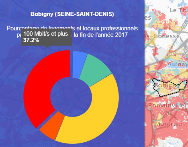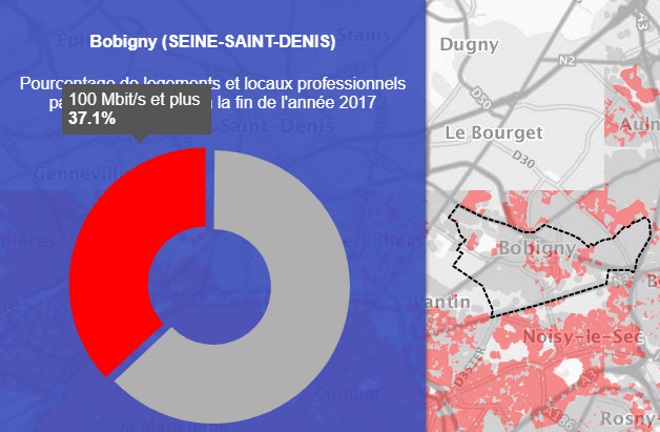 Grâce à la première carte on peut voir que la ville de Bobigny est couverte à 44.7% par le très haut débit.