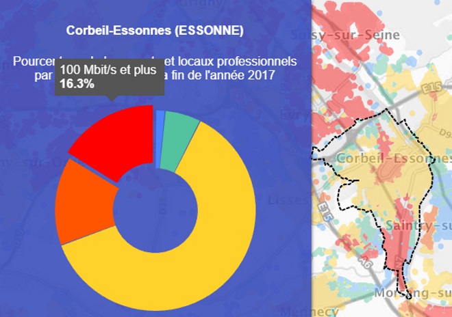 Grâce à la première carte on peut voir que la ville de Corbeil-Essonnes est couverte à 99% par le très haut débit.