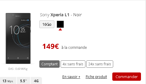 Sony Xperia L1 : Le tarif passe à 149€ comptant au lieu de 179€. La baisse de prix s’applique également au paiement en plusieurs fois sans frais : 4X : 38€ puis 37€*3 / 24X : 29€ puis 5€*24