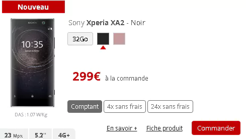 Sony Xperia XA2 : Le tarif passe à 299€ comptant au lieu de 339€. La baisse de prix s’applique également au paiement en plusieurs fois sans frais :4X : 77€ puis 74€*3 / 24X : 107€ puis 8€*24