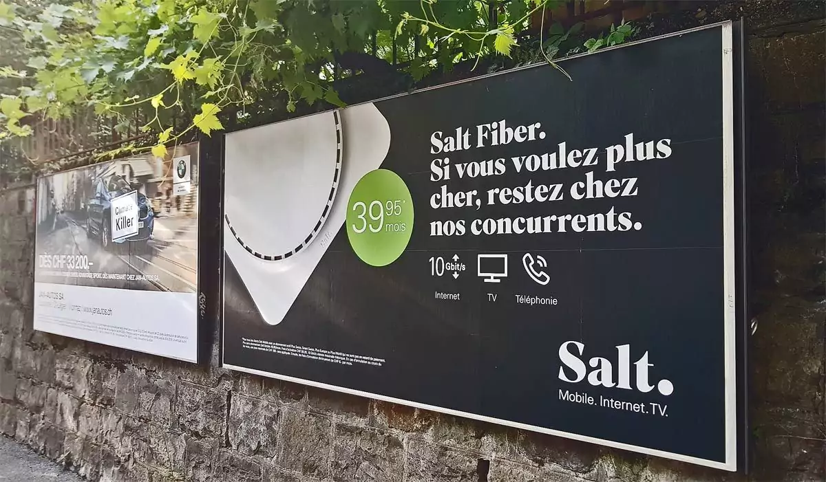 Si les consommateurs commencent à ressentir les effets de l’arrivée sur le marché du fixe de Salt en mars dernier, la concurrence baissant ses prix au compte-gouttes, ces derniers peuvent aussi constater que l’opérateur de Xavier Niel prend aujourd’hui un malin plaisir à tacler avec humour ses concurrents dans sa dernière campagne publicitaire. En effet, des affiches mettant en avant l’offre fibre à 10 Gigabits/sec à 39,95 CHF de Salt commencent à fleurir dans les rues. Sur celles-ci on peut lire notamment « Salt Fiber. Si vous voulez plus cher, restez chez nos concurrents ». Le blog télécoms de Xavier Studer rapporte avoir également entraperçu une variante, «si vous voulez moins rapide, restez chez nos concurrents !». Redoutable ?