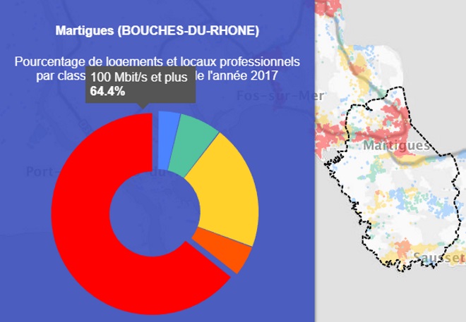 Grâce à la première carte on peut voir que la ville de Martigues est couverte à 69.4% par le très haut débit.