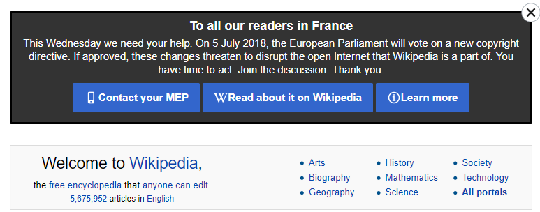 Sur la version anglaise de l’encyclopédie en ligne, un bandeau a été intégré en haut de la page d’accueil qui informe de la date à laquelle le projet doit être voté, le 5 juillet prochain.