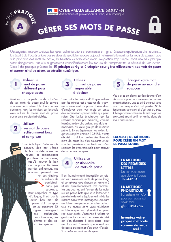 Pour aider les internautes, le site cybermalveillance.gouv.fr édité par l’Etat vient de publier un fiche pratique présente les 10 principales règles à adopter pour bien gérer ses mots de passe. Elle présente de manière illustrée les bonnes pratiques à adopter pour assurer au mieux la sécurité de ses mots de passe.