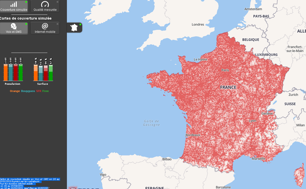 Ces nouvelles cartes nationales, lancées en septembre dernier, différencient désormais les zones de très bonne couverture, de bonne couverture, de couverture limitée, et celles où il n’y a pas de couverture, pour les services de voix et de SMS. Cet enrichissement permettra donc de mieux refléter la réalité vécue par les utilisateurs. Il est donc possible de zoomer dans telle rue, tel village, tel hameau et de visualiser où sont situés avec précision les "émetteurs" qu’ils soient 2G/3G ou 2G/3G/4G.
