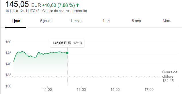 En effet, le titre d’Iliad décolle de la plus belle des manières aujourd’hui, auréolé d’une hausse de près de 8% à 145 euros à 12h, passant même à 9,48% (147,20€) à 13h45. La raison, Iliad a annoncé hier en fin d’après-midi avoir franchi la barre du million d’abonnés de l’autre côté des Alpes et ce seulement 50 jours après le lancement en grande pompe de son forfait 30 Go à 5,99€/mois. Le groupe a également indiqué étendre son offre commerciale aux 200 000 prochains abonnés. La réaction ne s’est donc pas faite attendre à la Bourse de Paris. "C’est plus que les attentes les plus optimistes", ont souligné ce matin des analystes de chez Oddo BHF, rapporte Zone Bourse.