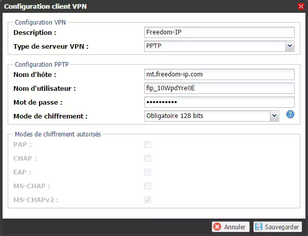 Dans l’onglet "Configuration VPN" puis dans "Ajouter une connexion" il faudra choisir un nom au client et le type de serveur VPN (PPTP ou openVPN), puis dans la partie configuration, les paramètres de connexion de votre VPN.