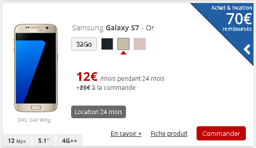 A l’issue des 2 années de location, vous pouvez choisir de continuer à louer votre smartphone ou choisir un autre terminal qui sera plus récent. En cas de manquement à l’obligation de restitution du mobile ou de restitution dans un mauvais état de fonctionnement, une somme de 250€ pour le Galaxy S78 et 120€ pour le Galaxy S7 vous sera facturée ou, dans le cadre de l’exercice du droit de rétractation, facturation du prix public de vente du mobile en vigueur au jour de la commande (déduction faite des sommes déjà versées).
