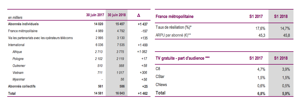 A noter toutefois que le chiffre d’affaires mondial du groupe Canal+ s’établit à 2 575 millions d’euros, en croissance de 0,8% par rapport au premier semestre 2017. En France, celui-ci est est encore " en léger recul malgré un dynamique très positive du taux de résiliation", à savoir de 19% sur un an, indique un communiqué. Au total, le parc d’abonnés du groupe atteint 16 millions contre 14,6 millions fin juin 2017.
