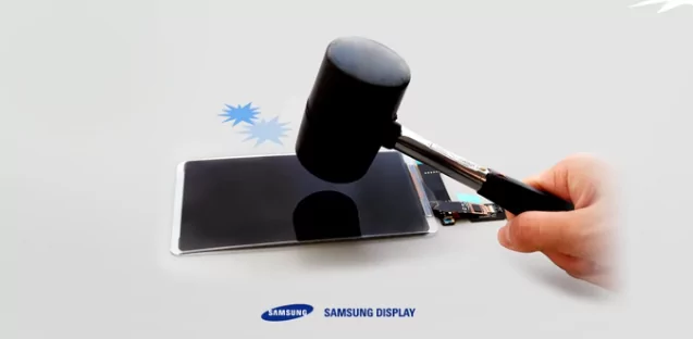 S’il ne se casse pas c’est que la couche de verre qui protège normalement les écrans a été remplacée par une fine couche de plastique souple. Pour en faire la démonstration, Samsung a publié une vidéo où l’écran passe avec succès le test spectaculaire du marteau, aucune trace, même pas une rayure.