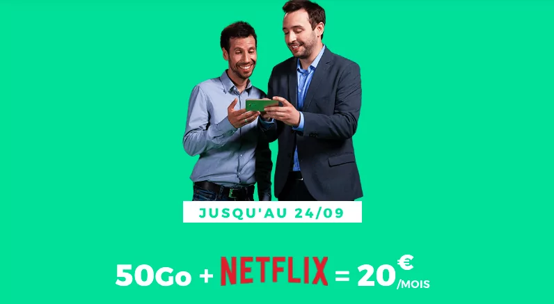 Jusqu’au 24 septembre il est possible de souscrire à une offre comprenant un forfait appels, SMS/MMS illimités avec 50Go de data et Netflix pour 20 euros par mois.