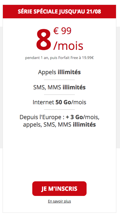 Pour rappel, cette série spéciale sans engagement intercalée entre les deux forfaits historiques de l’opérateur, comprend pour la bagatelle de 8,99€/mois pendant un an, appels, SMS et MMS illimités, 50Go en France métropolitaine ou encore 3 Go/mois en roaming depuis Europe et DOM en 3G. A l’issue des 12 mois, les abonnés basculeront automatiquement sur le Forfait Free classique 100Go à 19,99€/mois ou data illimitée à 15,99€/mois pour les abonnés Freebox.